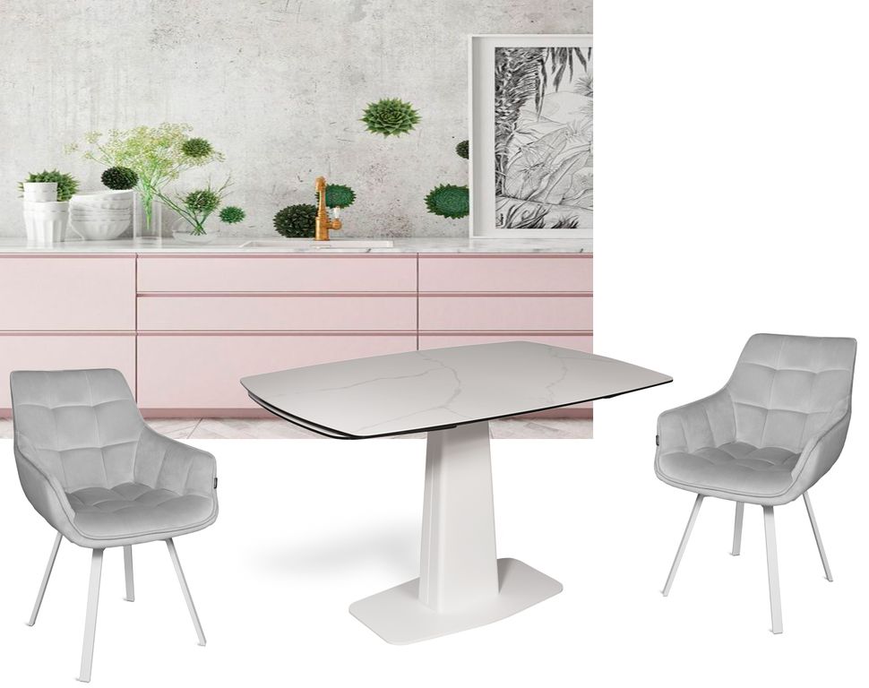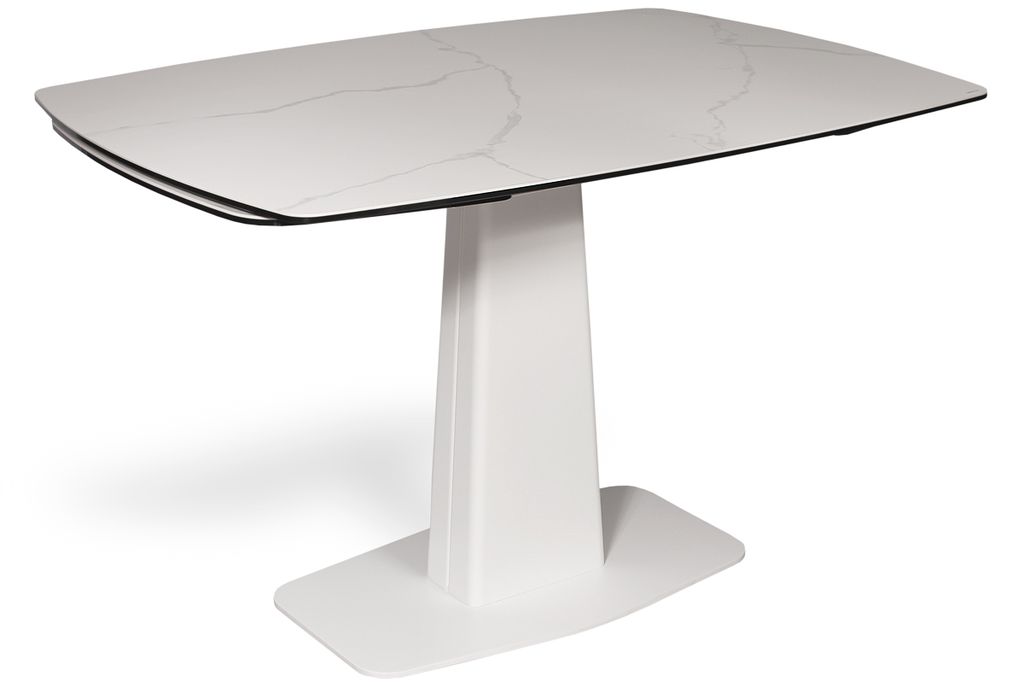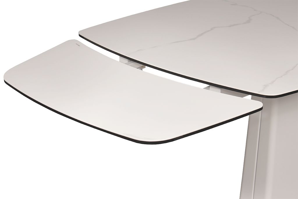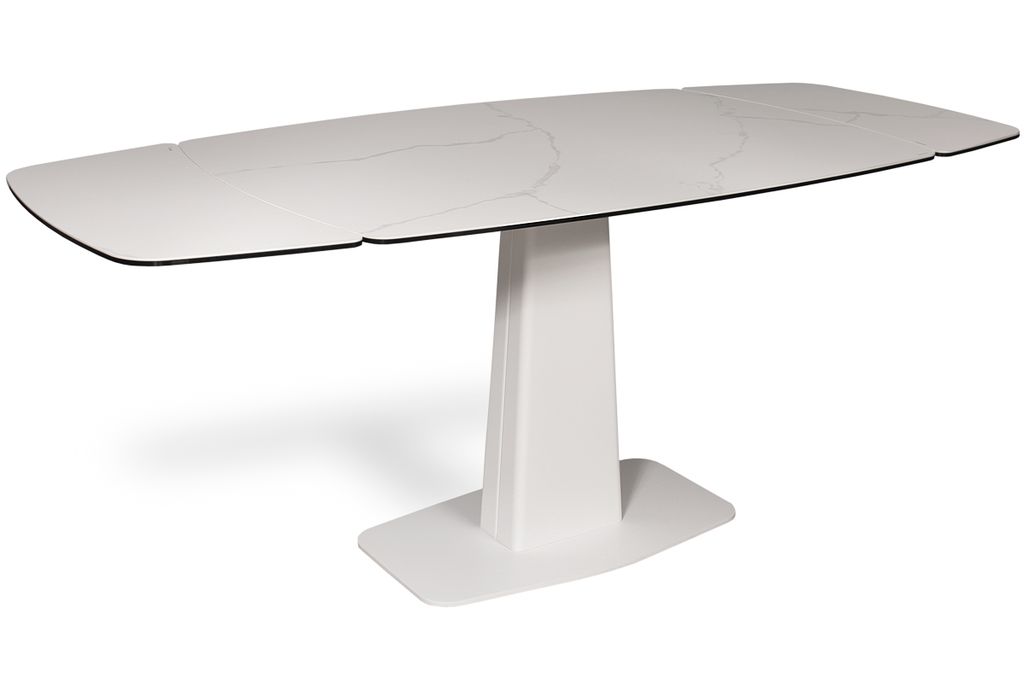 Модный стол востребованного размера для небольшого кухонного пространства. Центральная металлическая ножка красивой формы поддерживает керамическую столешницу, оснащенную высокотехнологичным механизмом раскладывания двух торцевых вставок. Обтекаемый дизайн всех элементов данного стола эргономичен и соответствует всем требованиям современного кухонного интерьера.