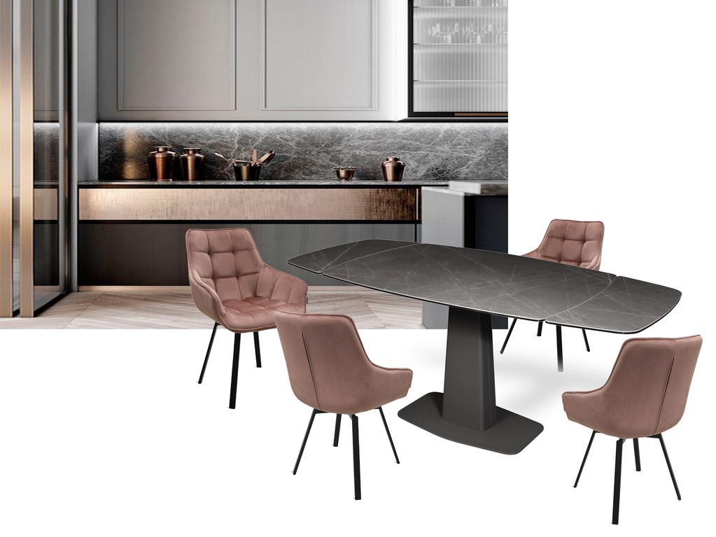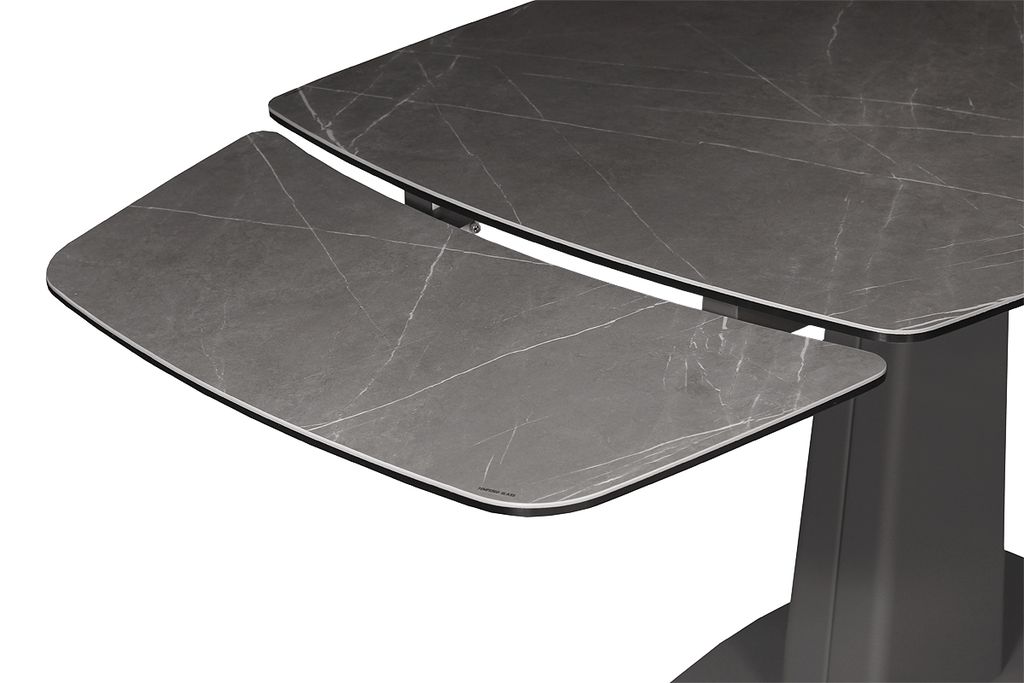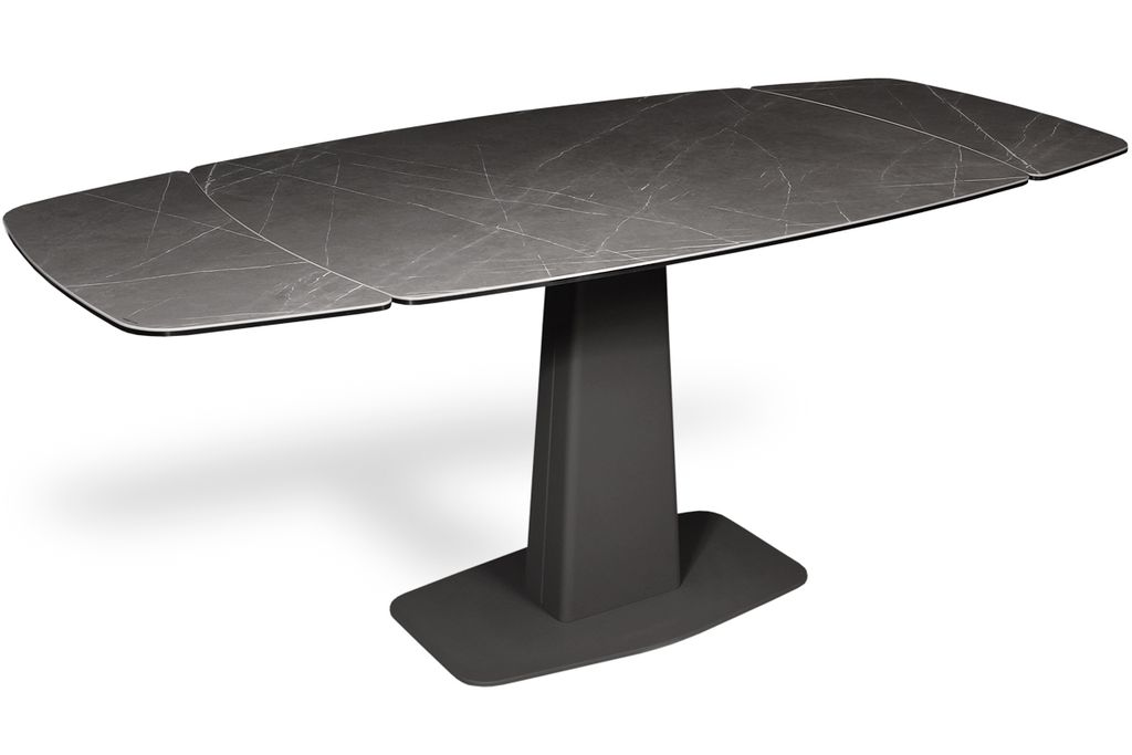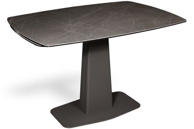 Модный стол востребованного размера для небольшого кухонного пространства. Центральная металлическая ножка красивой формы поддерживает керамическую столешницу, оснащенную высокотехнологичным механизмом раскладывания двух торцевых вставок. Обтекаемый дизайн всех элементов данного стола эргономичен и соответствует всем требованиям современного кухонного интерьера.