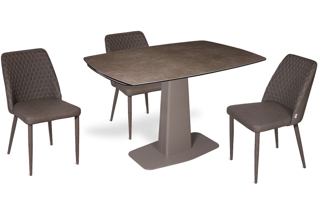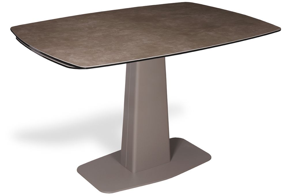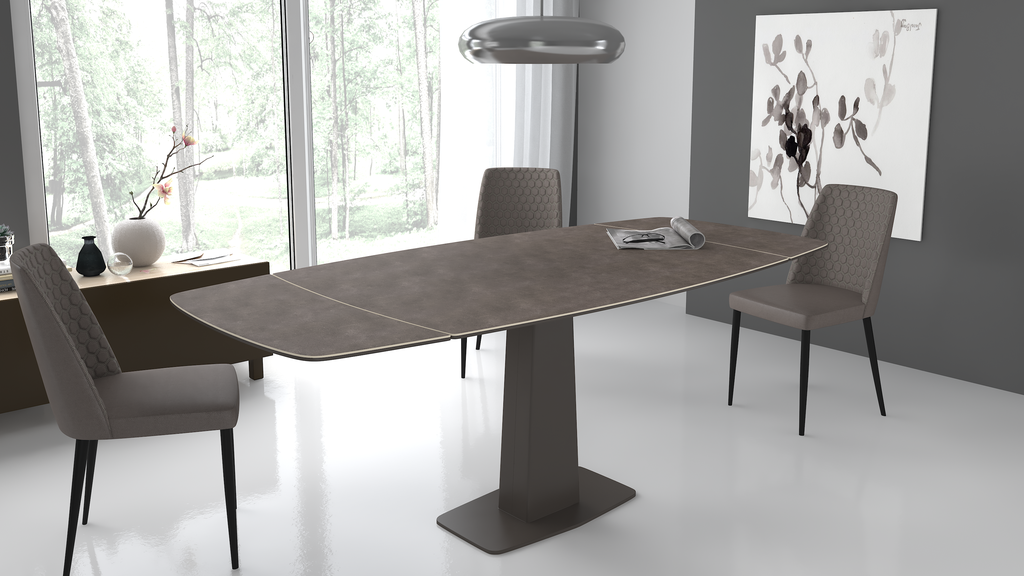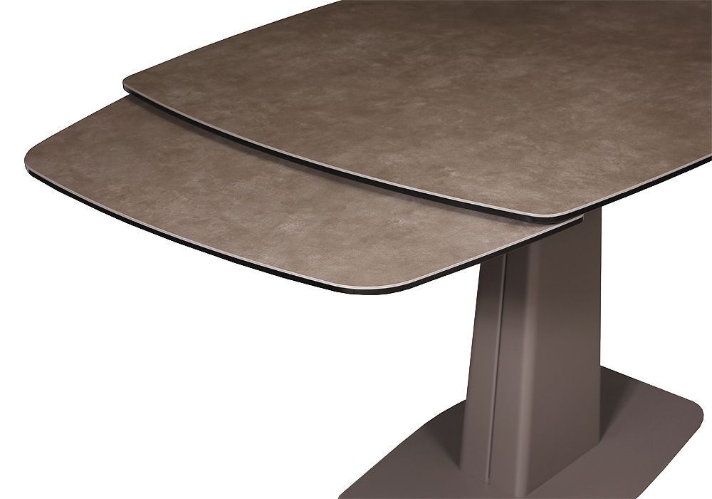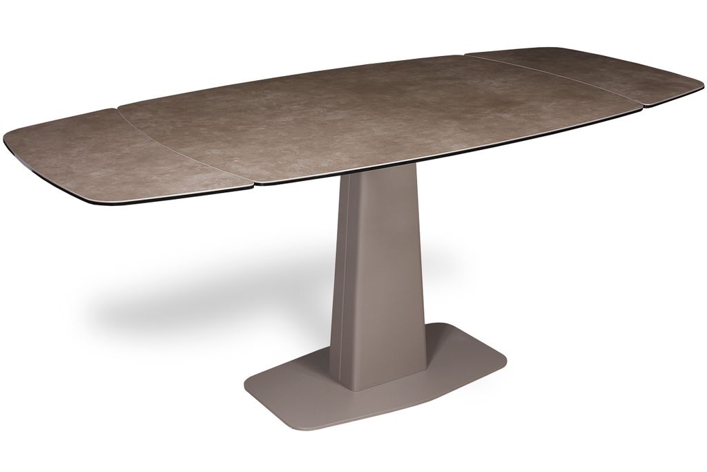 Модный стол востребованного размера для небольшого кухонного пространства. Центральная металлическая ножка красивой формы поддерживает керамическую столешницу, оснащенную высокотехнологичным механизмом раскладывания двух торцевых вставок. Обтекаемый дизайн всех элементов данного стола эргономичен и соответствует всем требованиям современного кухонного интерьера.