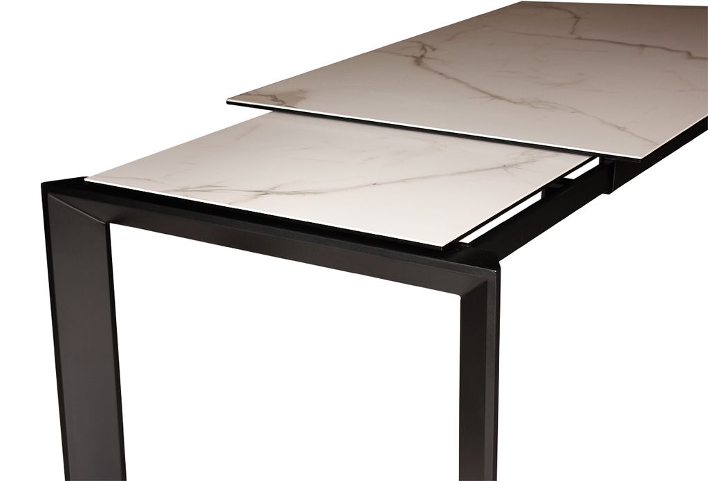 Тема в дизайне столов, поддержанная всеми итальянскими конструкторами и получившая реальное воплощение только сегодня - в эпоху высокотехнологичных материалов и механизмов раздвижения столешниц. В данном случае столешница представляет собой композит 3-миллимитрового слоя дорогой иитальянской керамики и закаленного стекла. Уникальный механизм раздвижения позволяет с невероятной легкостью увеличить стол на 70 см!