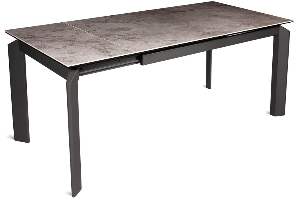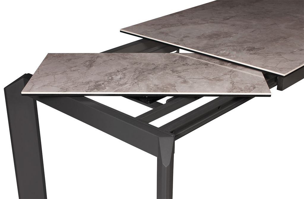 Прямоугольный стол с дизайнерскими акцентами на верхней части ножек. Стол оснащен высокотехнологичным механизмом раздвижения ножек, что дает возможность увеличить мраморную поверхность стола на 2 посадочных места. Данная модель прекрасно впишется в любое кухонно-гостиное пространство.