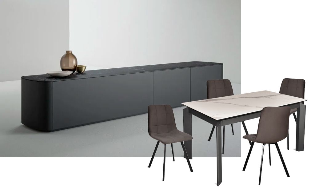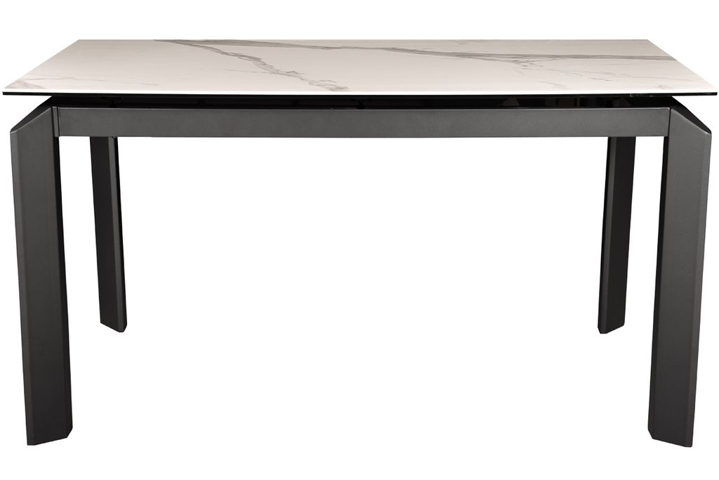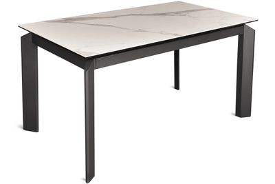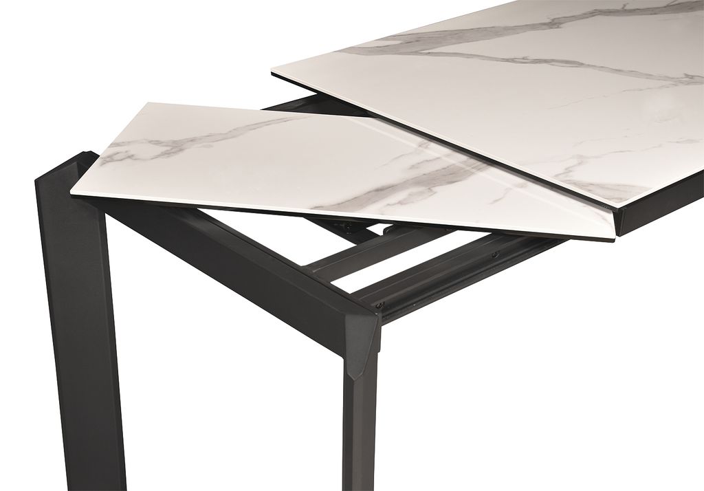 Прямоугольный стол с дизайнерскими акцентами на верхней части ножек. Стол оснащен высокотехнологичным механизмом раздвижения ножек, что дает возможность увеличить мраморную поверхность стола на 2 посадочных места. Данная модель прекрасно впишется в любое кухонно-гостиное пространство.