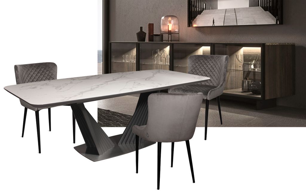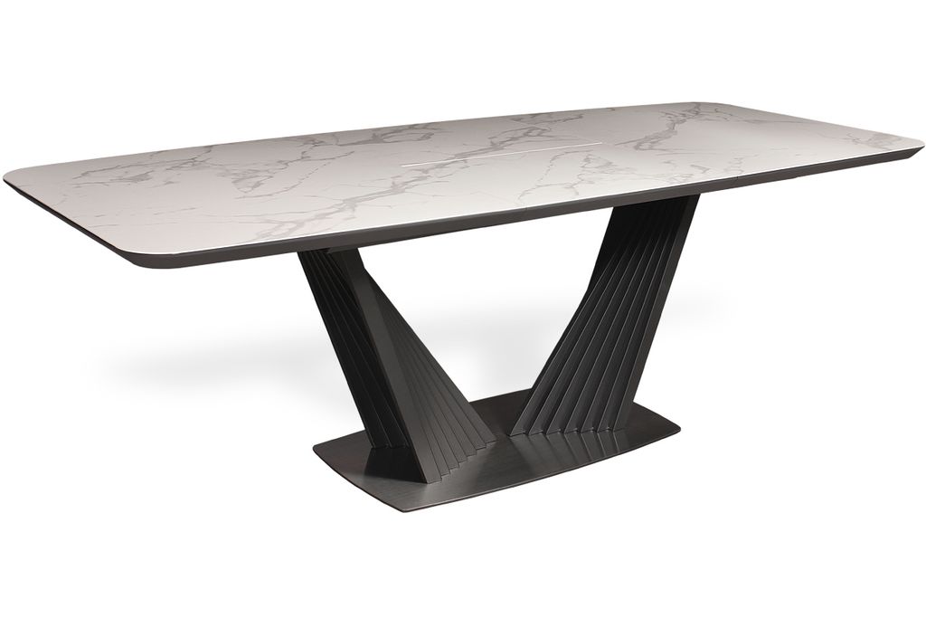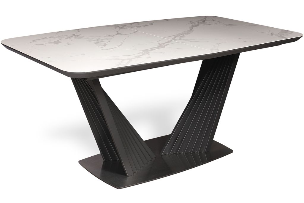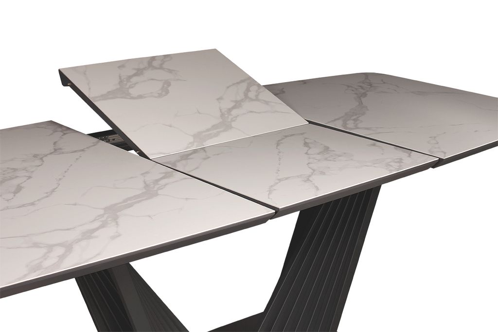 Красивый и очень продуманный дизайн с безусловным акцентом на подстолье из листового гофрированного металла. Керамическая столешница обтекаемой формы для прочности наклеена на деревянную основу. Классический механизм "бабочка" увеличивает столешницу на 60 см за счет керамической вставки. Модель эргономична, красивое и сложное по дизайну подстолье абсолютно удобно для размещения минимум 10 человек.