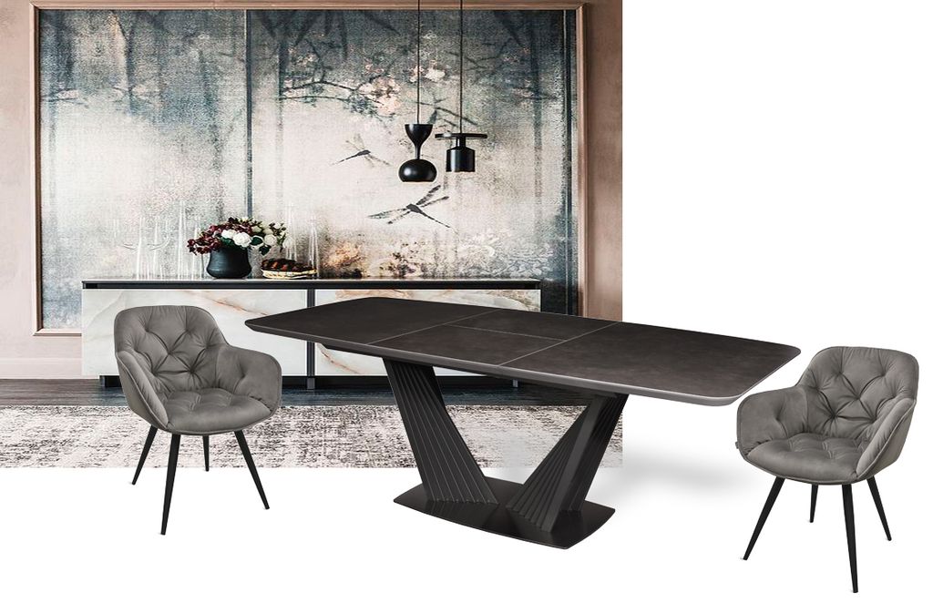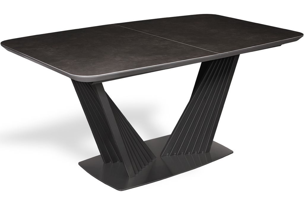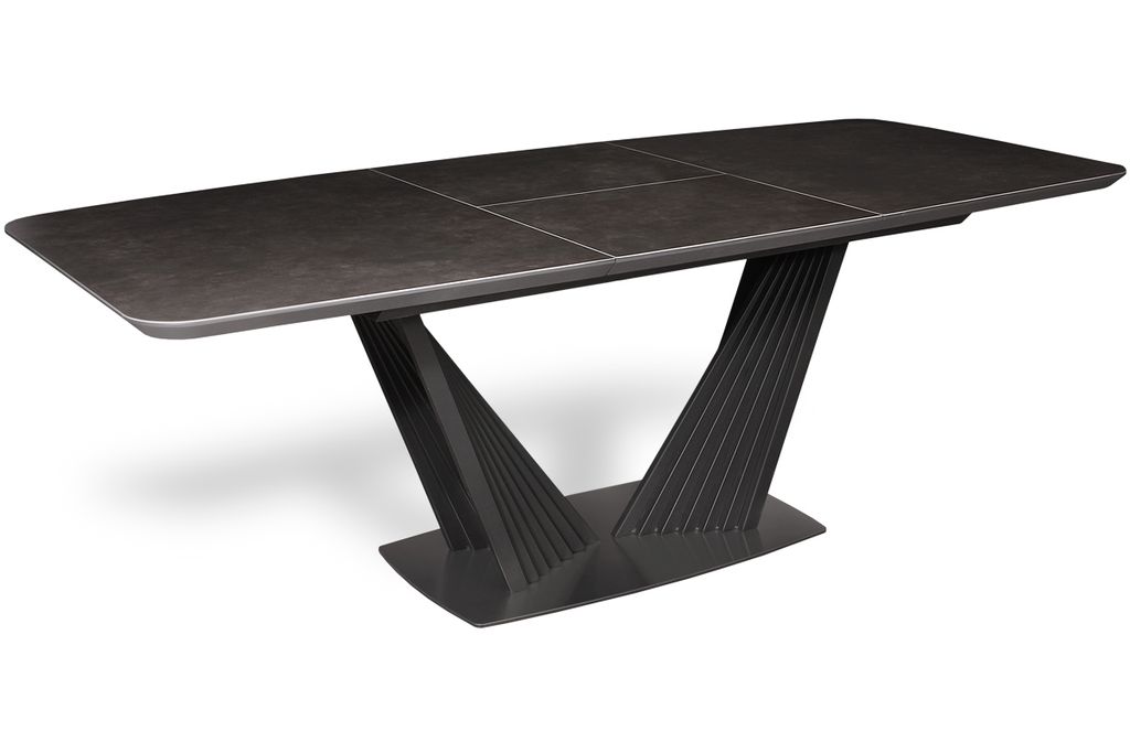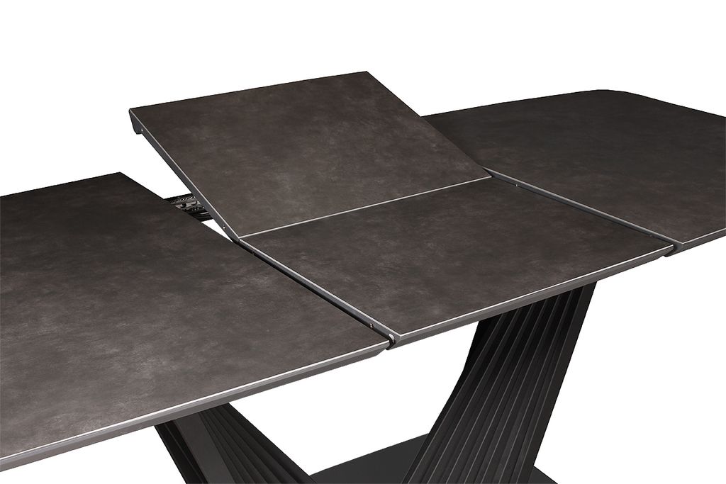 Красивый и очень продуманный дизайн с безусловным акцентом на подстолье из листового гофрированного металла. Керамическая столешница обтекаемой формы для прочности наклеена на деревянную основу. Классический механизм "бабочка" увеличивает столешницу на 60 см за счет керамической вставки. Модель эргономична, красивое и сложное по дизайну подстолье абсолютно удобно для размещения минимум 10 человек.