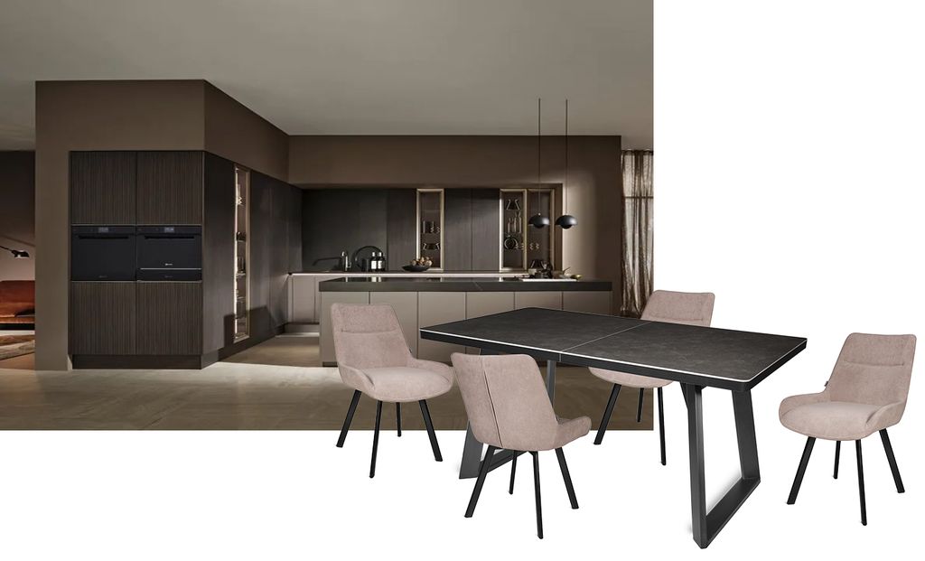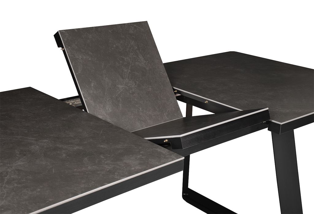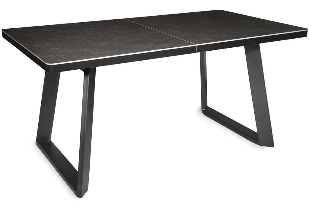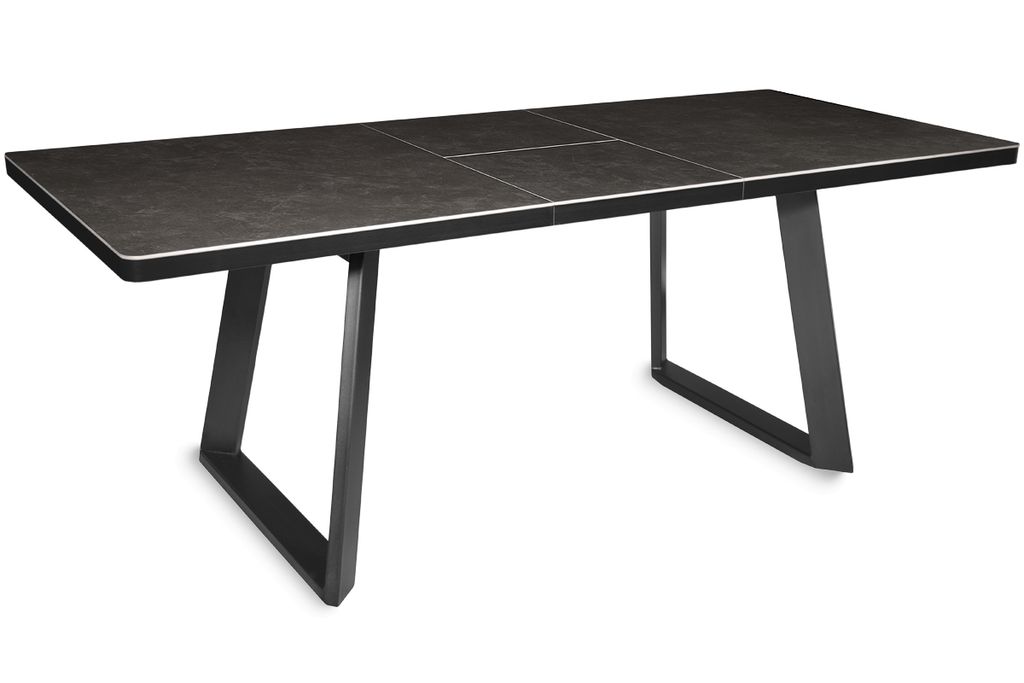 Современный стол актуального дизайна на П-образных металлических опорах. Столешница, покрытая красивым керамогранитом, оснащена качественным механизмом раздвижения «бабочка», увеличивающим керамическую поверхность стола на 45 см. Металлические опоры имеют интересную конфигурацию, способствующую комфортному размещению за столом минимум 8 человек.