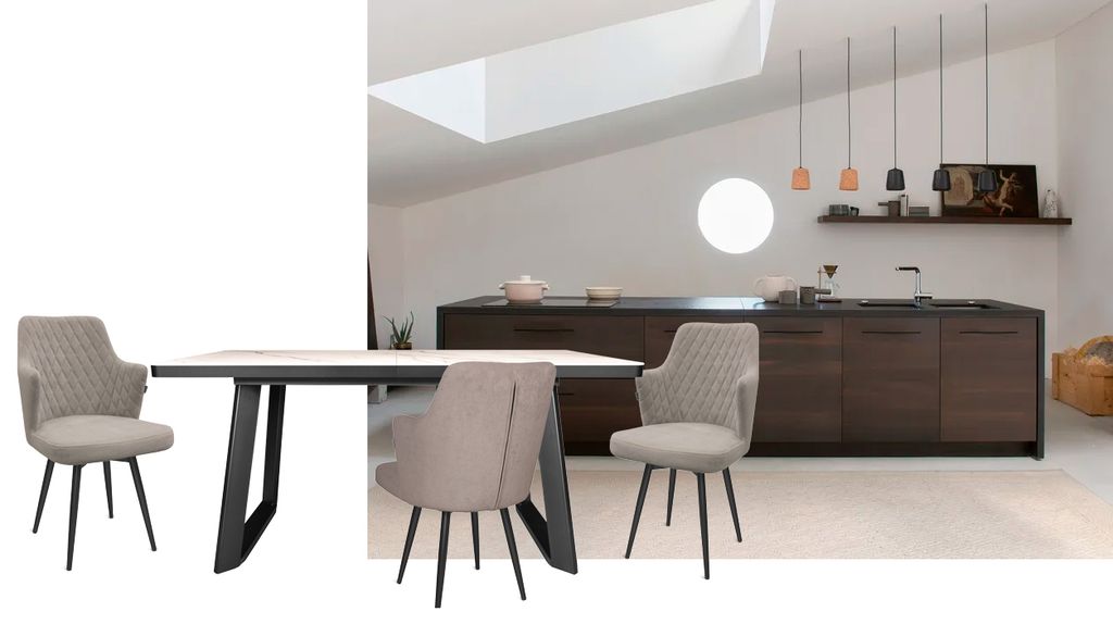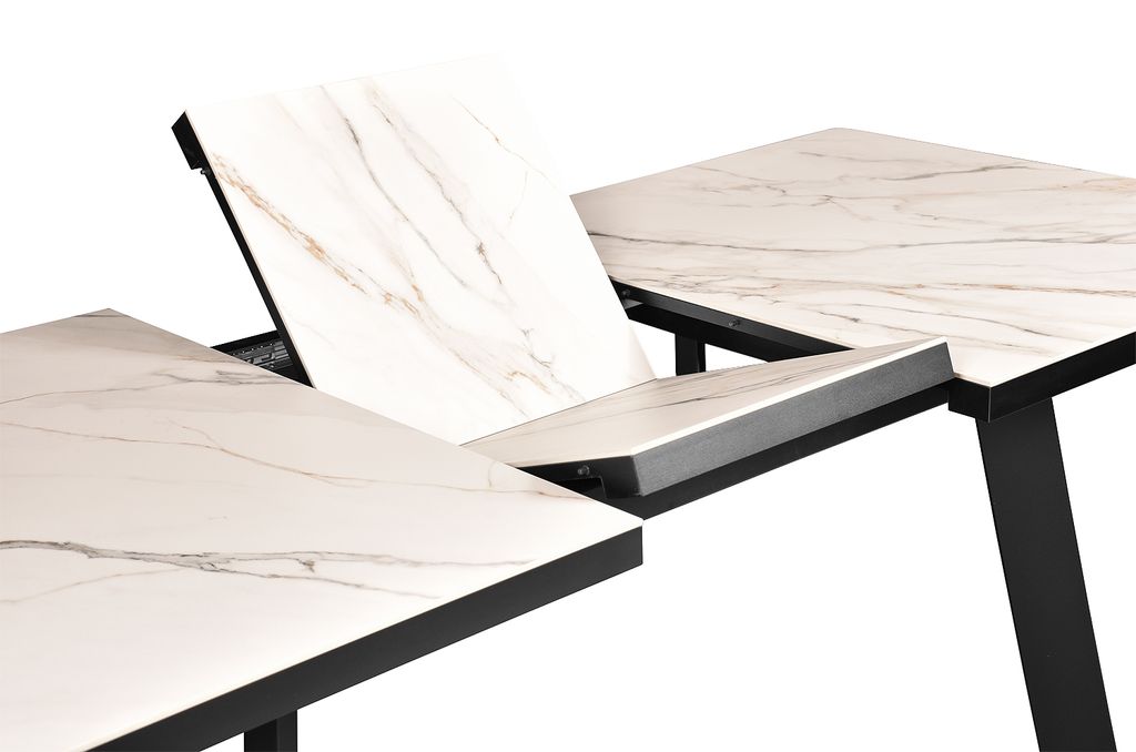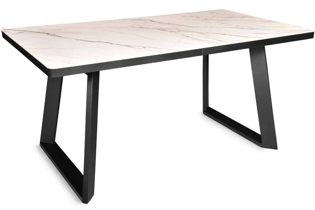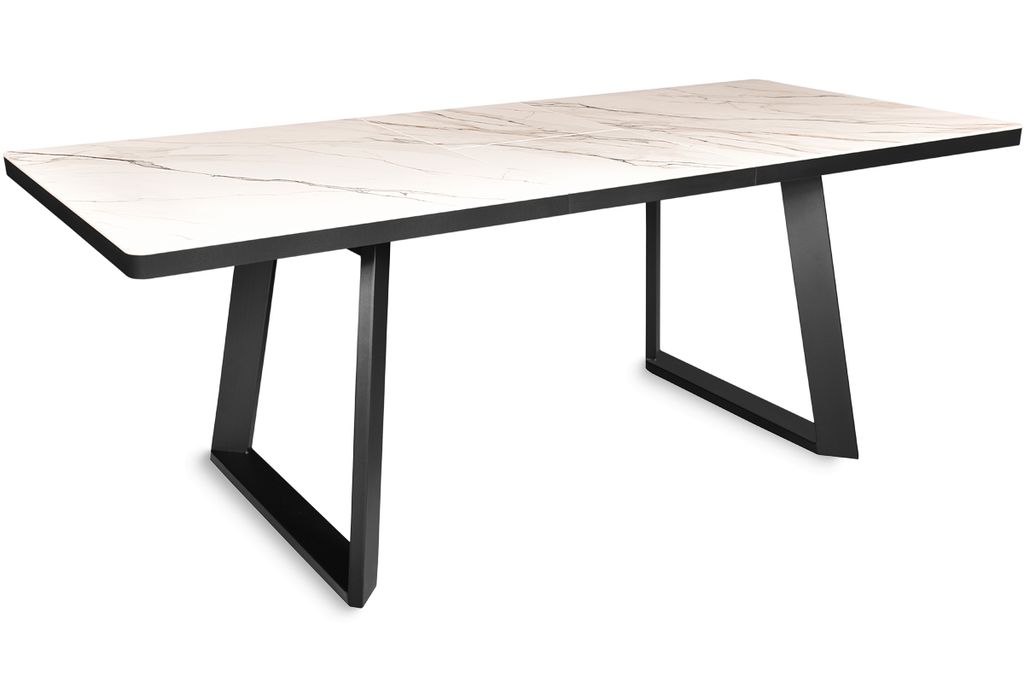 Современный стол актуального дизайна на П-образных металлических опорах. Столешница, покрытая красивым керамогранитом, оснащена качественным механизмом раздвижения «бабочка», увеличивающим керамическую поверхность стола на 45 см. Металлические опоры имеют интересную конфигурацию, способствующую комфортному размещению за столом минимум 8 человек.