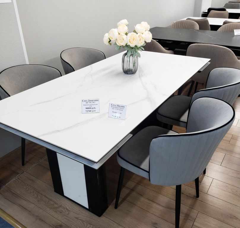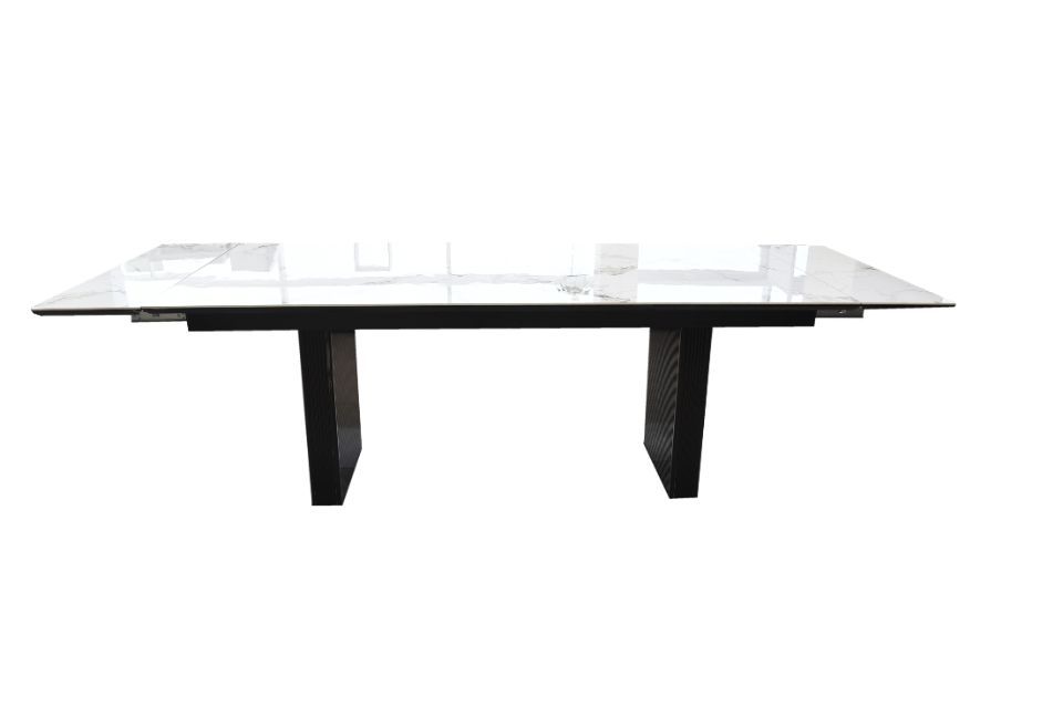 Стол Джорджио. Размер 180, две боковые вставки по 30 см. Ширина 90 см. Столешница. Материал исполнения: керамогранит или компакт плита 3 мм. Механизм торцевой с плавным подъемом вставки. Подстолье: МДФ в пленке ПВХ - 2 стандартных цвета пленки: глянцевый белый и глянцевый черный. Рама металл. Порошковая покраска белый муар или черный муар. Опора металл. Вставка керамогранит в цвет столешницы.